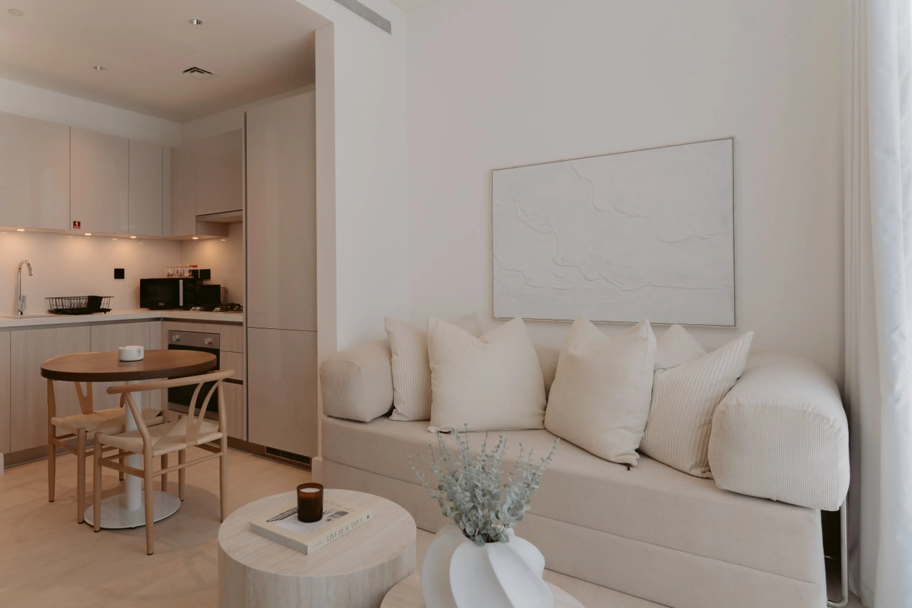 Experience refined living in this modern 1-bedroom apartment at The Crest, Sobha Hartland, where comfort meets contemporary style. This elegant home features a spacious bedroom with a king-size bed, a cozy living area with a smart TV, and a fully equipped kitchen with a dining space. Step onto the p...