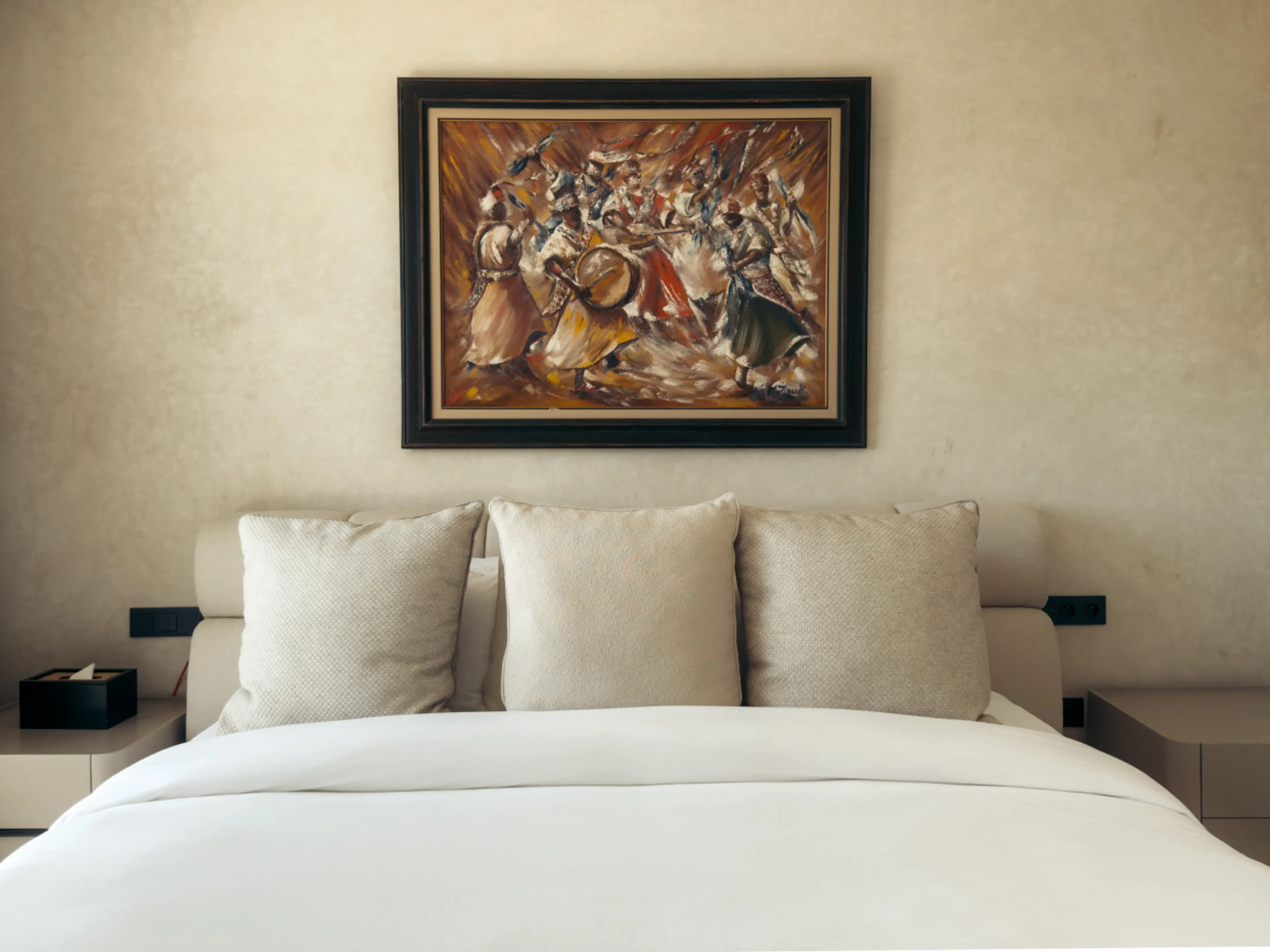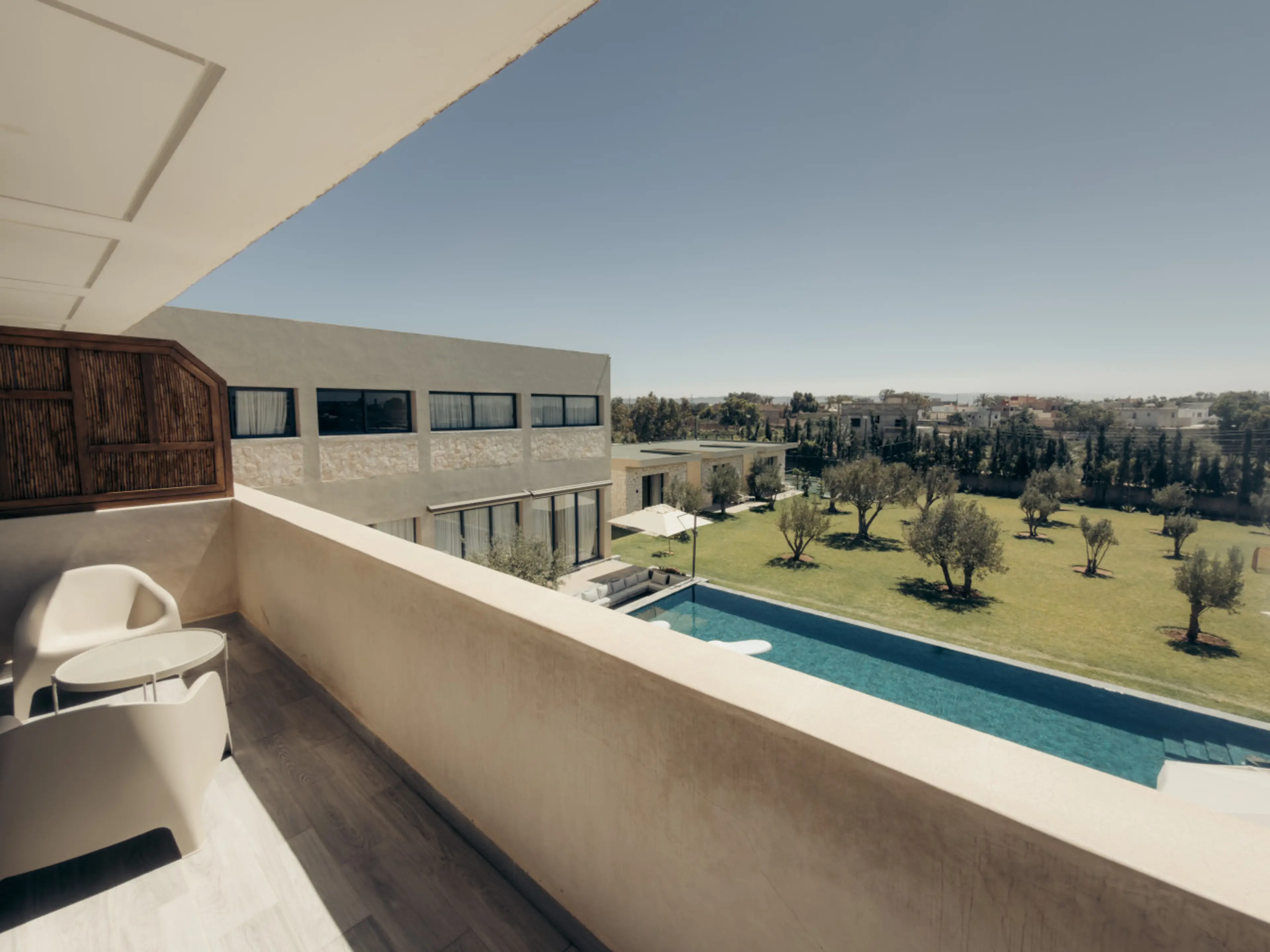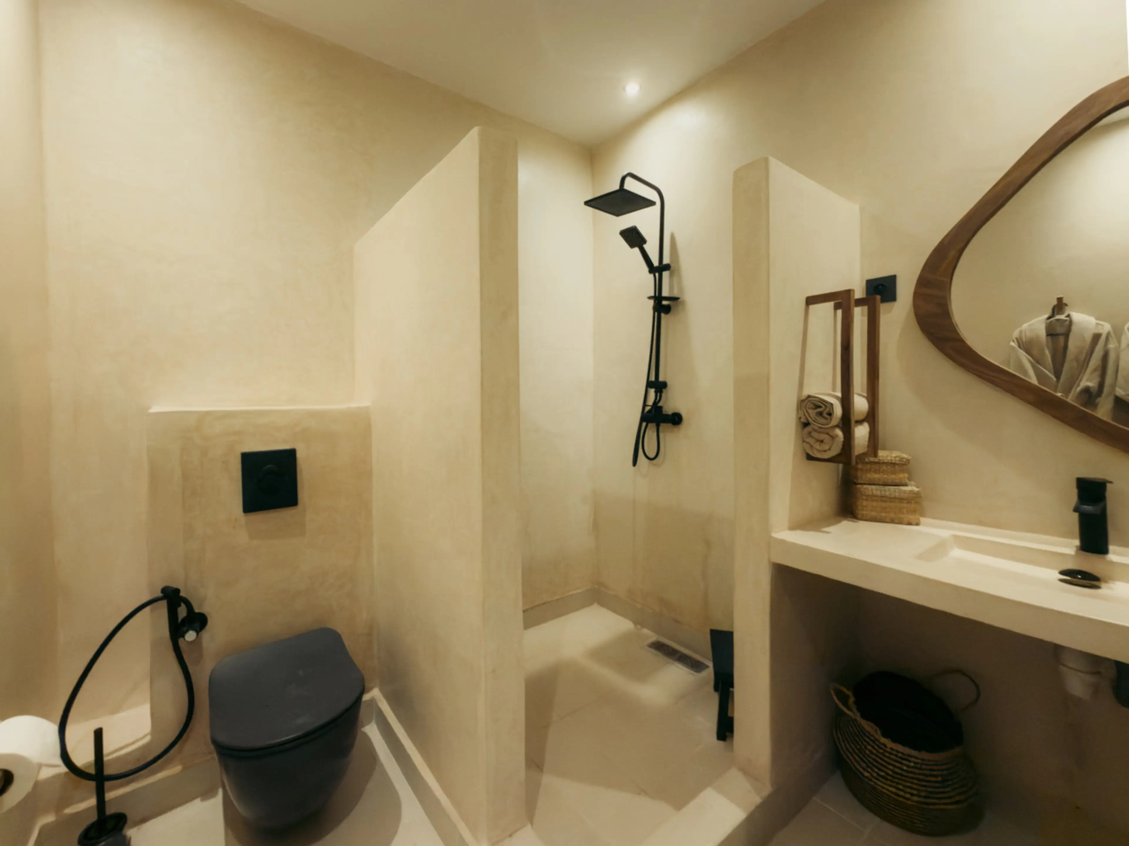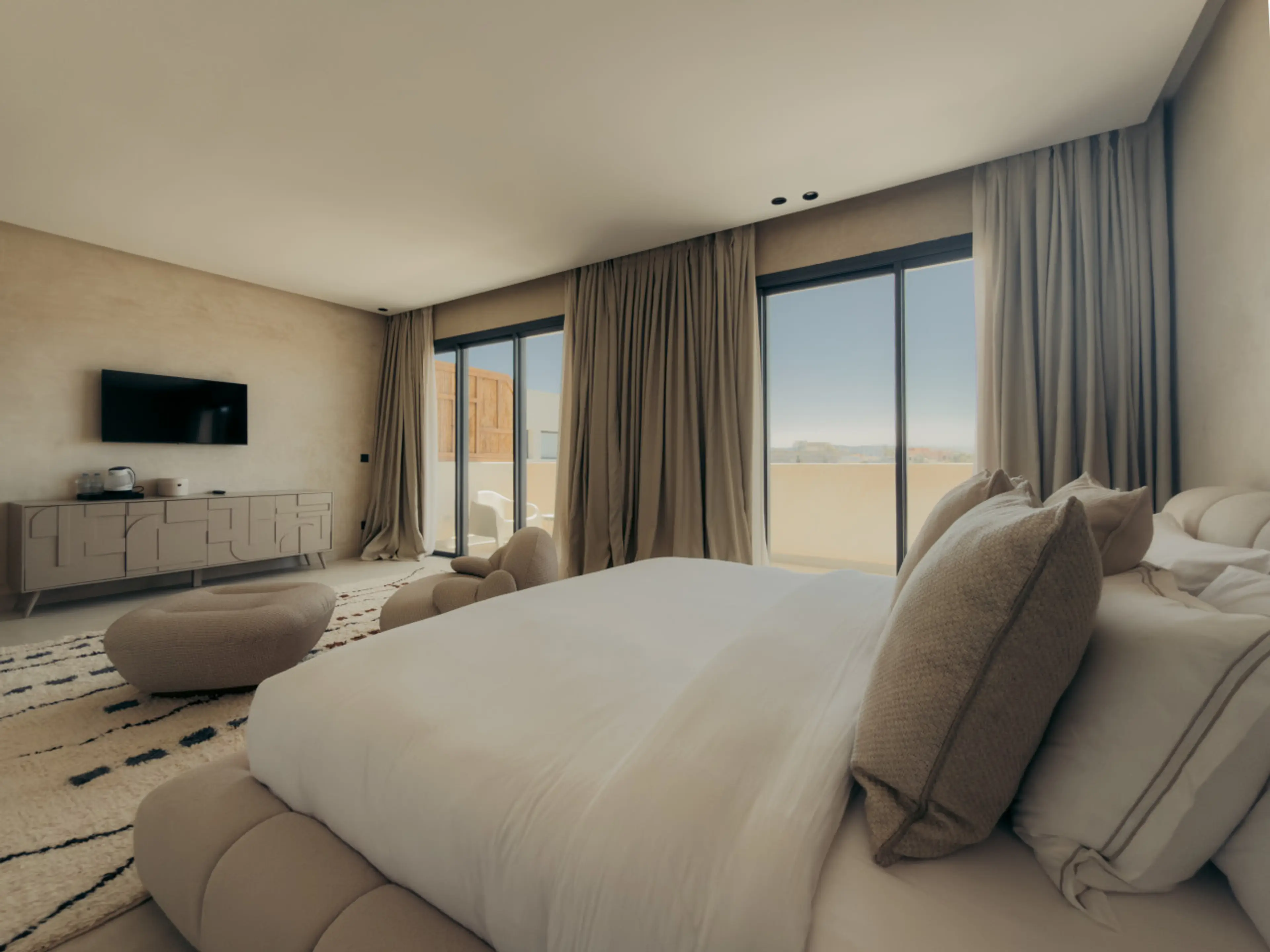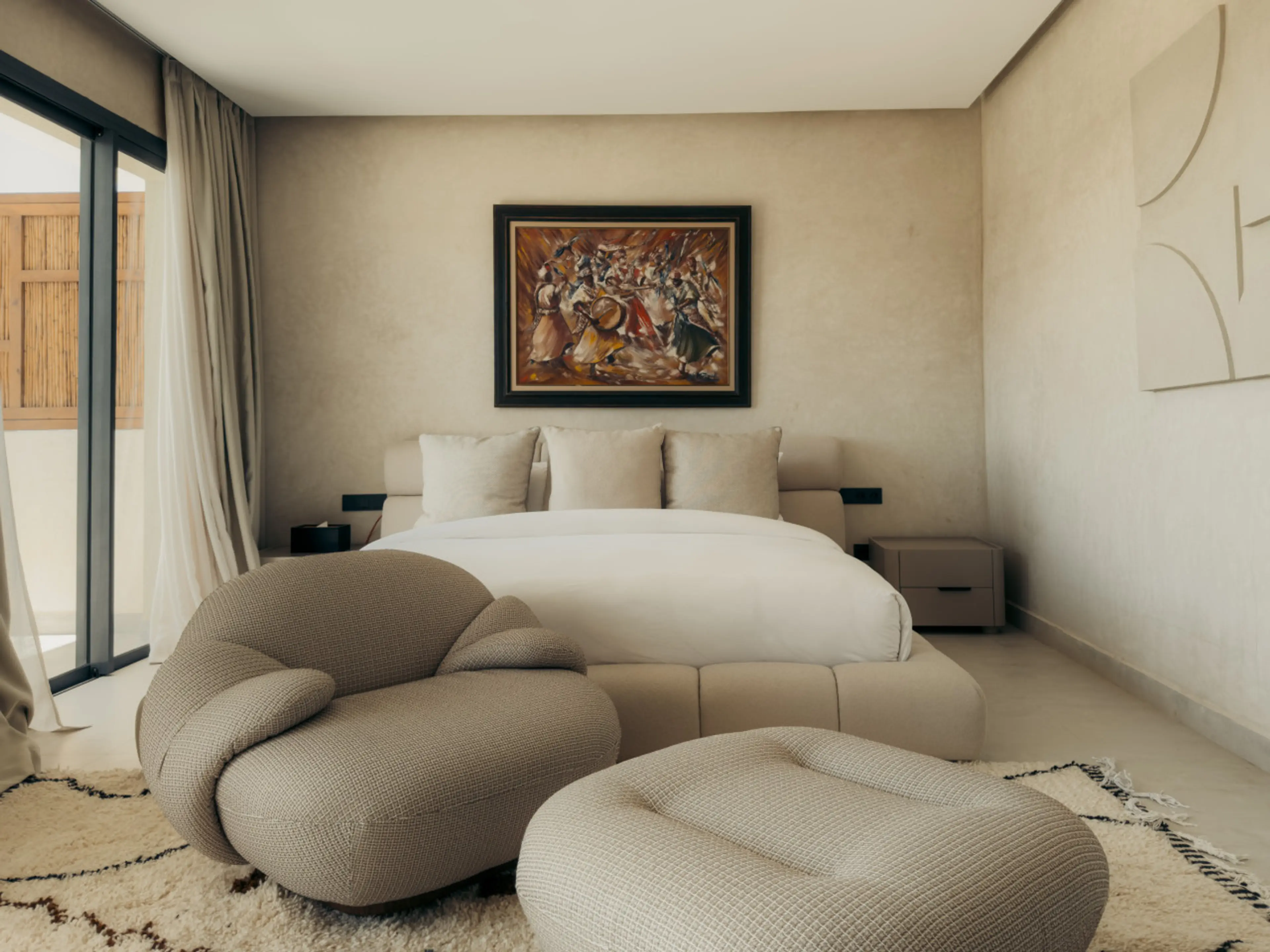 A warm and inviting private room with its own balcony in Maison Azen, a beautifully designed villa set in the countryside just 12 minutes from Essaouira. Earthy tones and contemporary Moroccan architecture create a refined yet relaxed atmosphere. Guests enjoy shared living spaces, a pool and garden,...