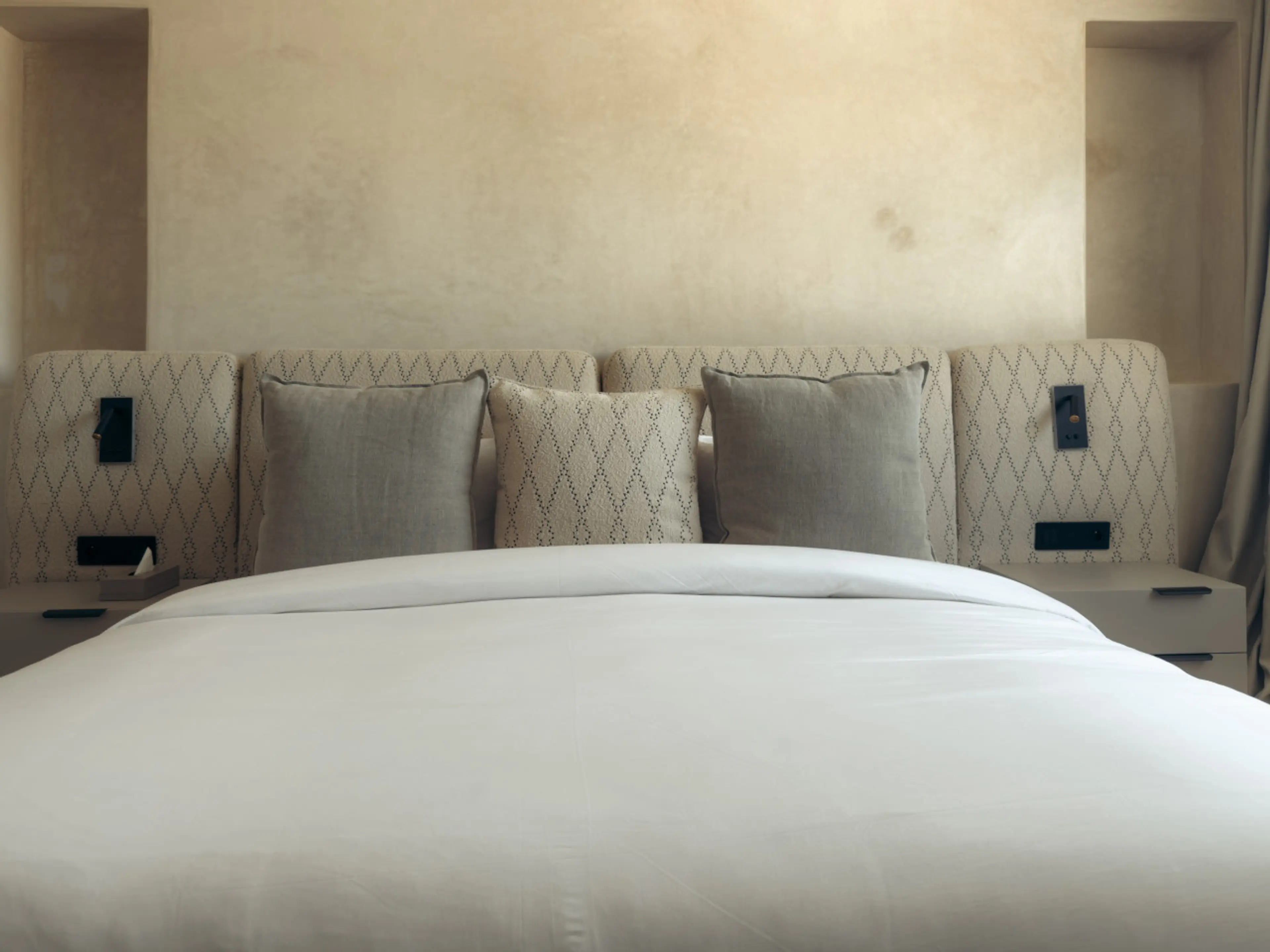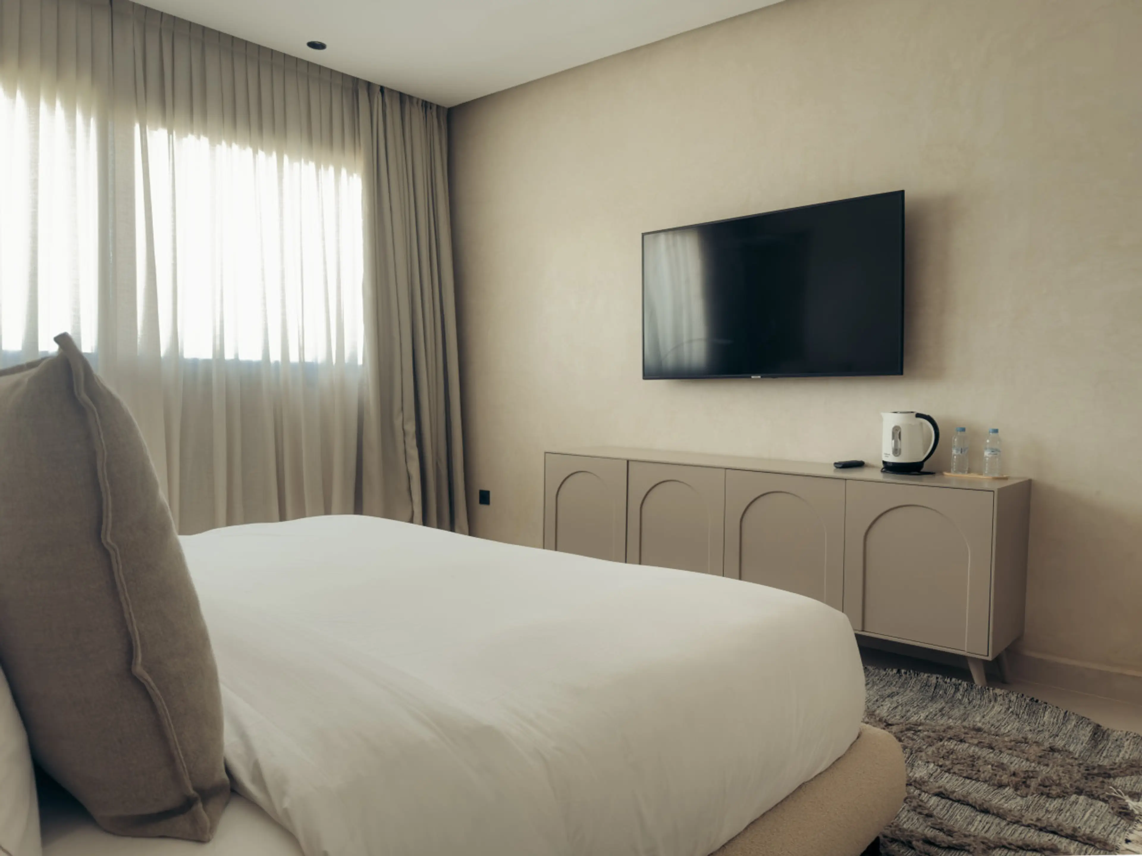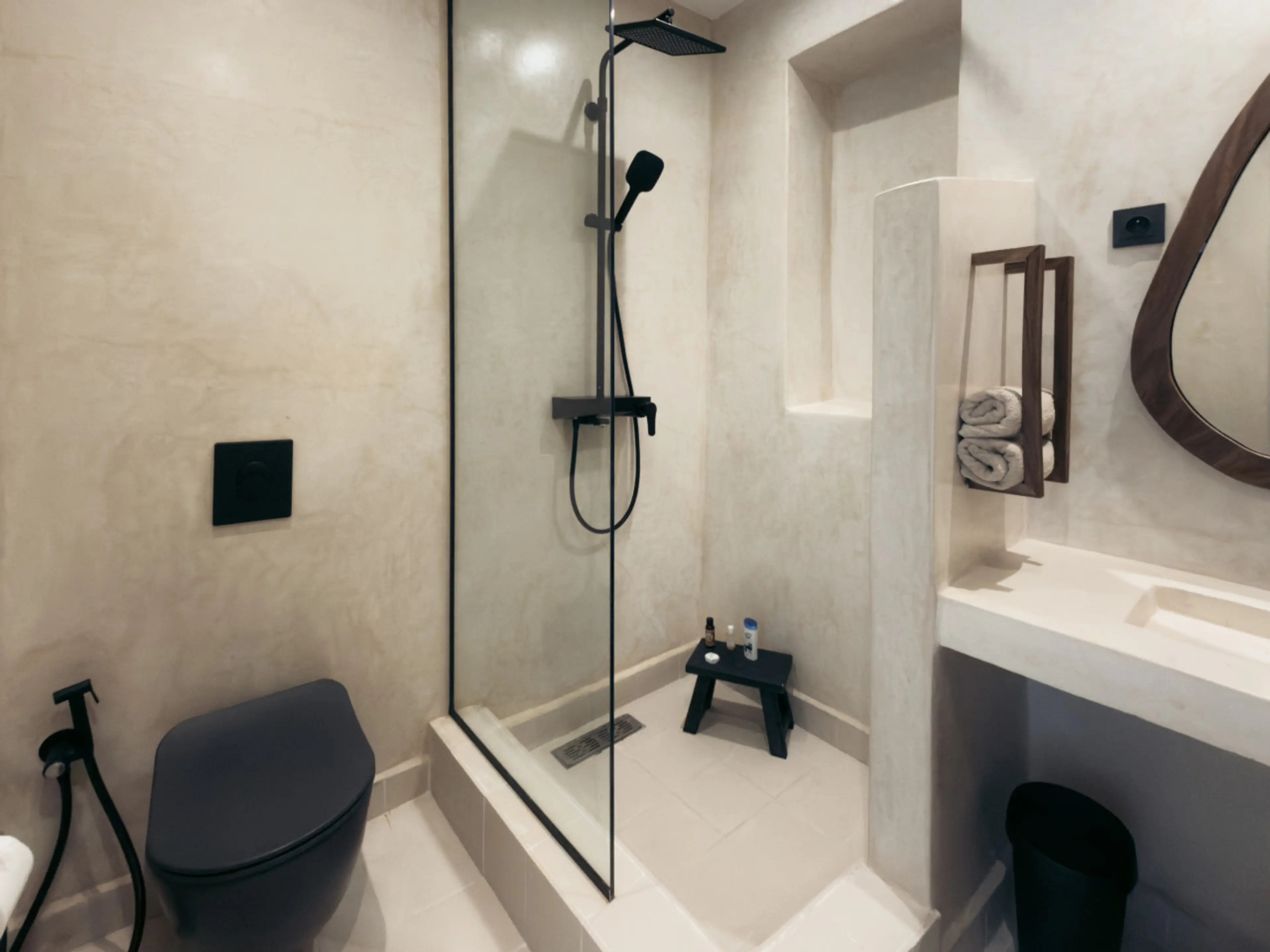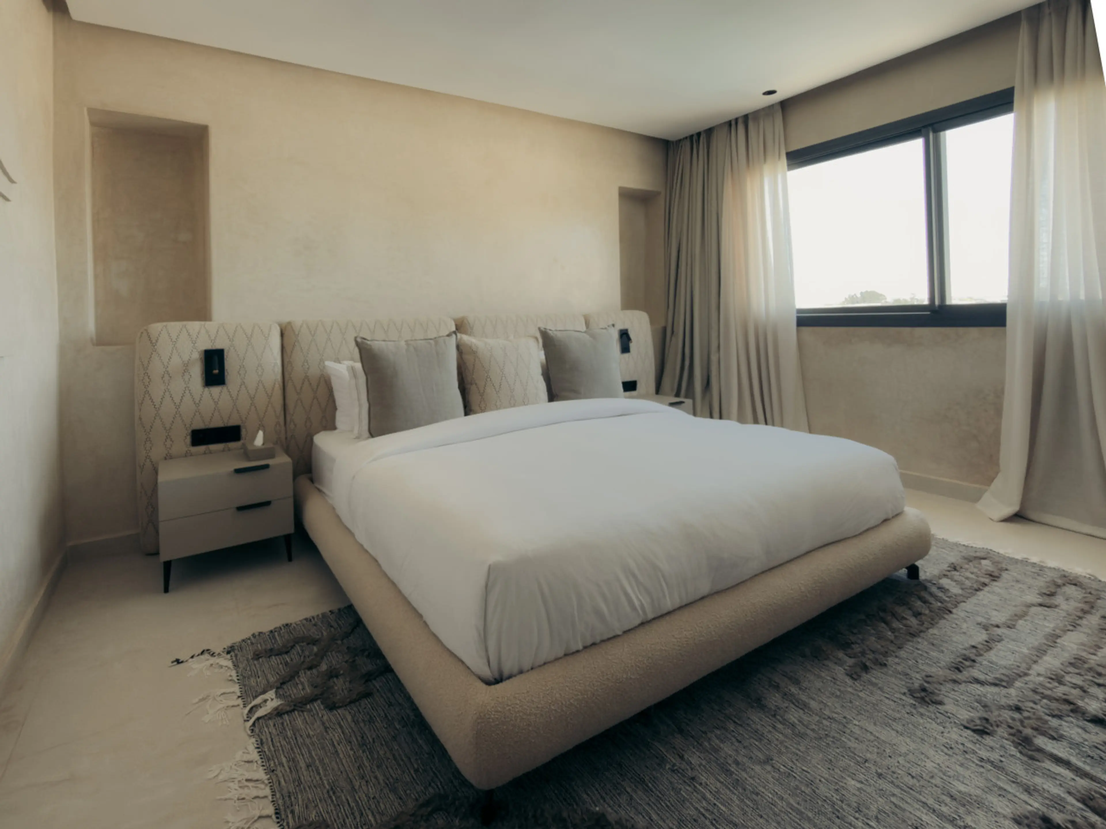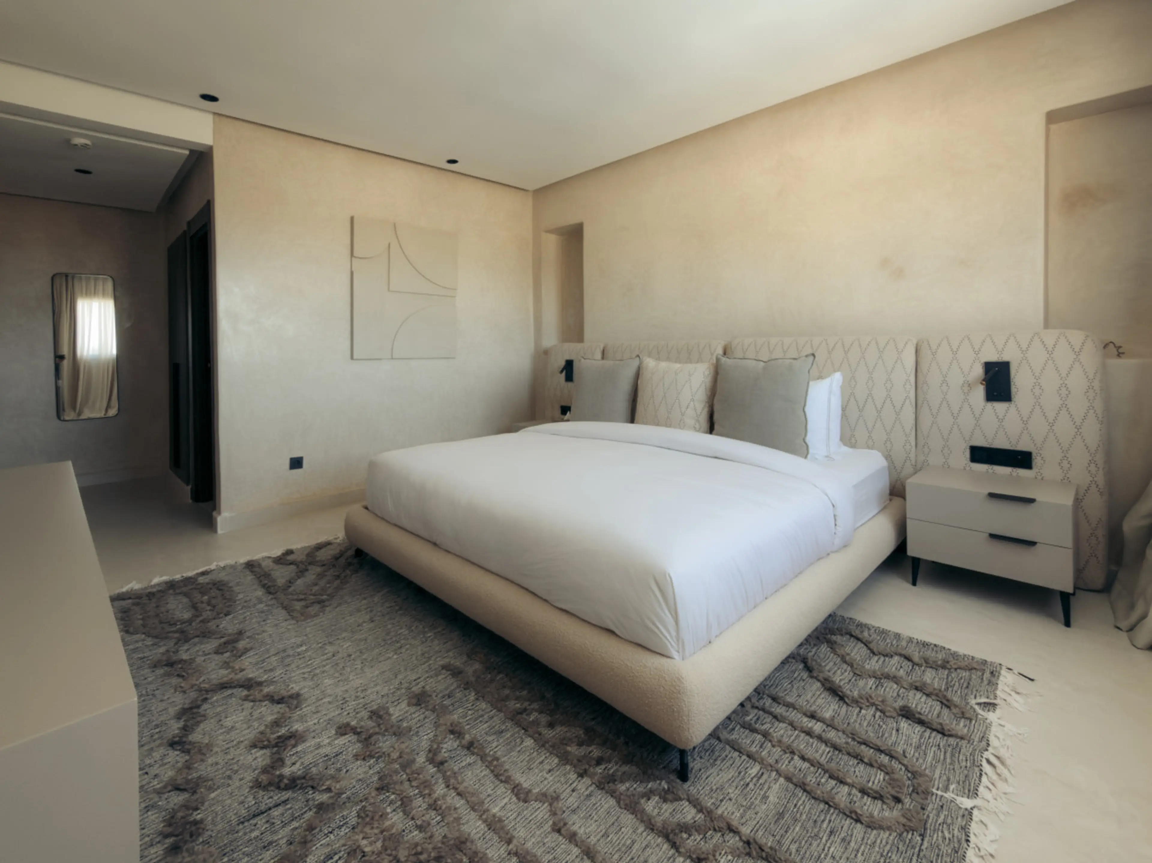 A calm, sun-filled private room with a private balcony in Maison Azen, a beautifully designed villa set in the countryside just 12 minutes from Essaouira. Soft natural interiors and modern Moroccan architecture create a serene, refined atmosphere. Guests enjoy shared living spaces, a pool and garden...